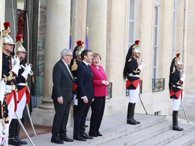 這是習(xí)主席抵達(dá)前,法國總統(tǒng)馬克龍、德國總理默克爾、歐盟委員會(huì)主席容克一齊在臺(tái)階上準(zhǔn)備迎接。(央視記者拍攝)
