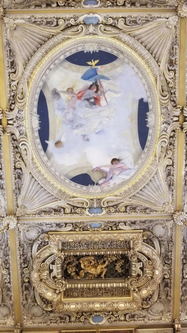 節(jié)日大廳屋頂中部是壁畫《共和國保衛(wèi)和平》,由法國著名畫家紀(jì)堯姆?迪比夫(Guillaume Dubufe)于1896年所作。(央視記者洪磊拍攝)