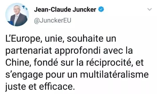 歐盟委員會(huì)主席容克也發(fā)文稱,“歐盟達(dá)成統(tǒng)一戰(zhàn)線,希望同中國建立更加親密的合作伙伴關(guān)系。這種意愿是相互的。歐盟也決心投身到更公平和更高效的多邊主義中去?!?央視記者康玉斌提供)