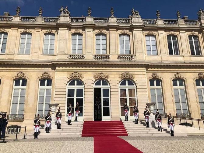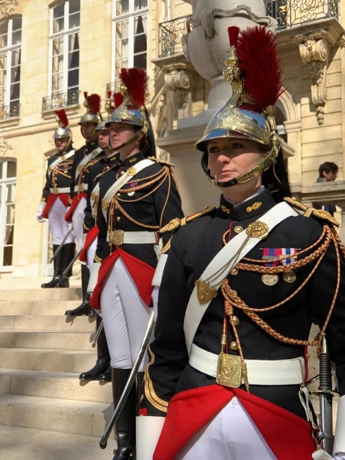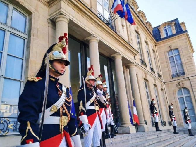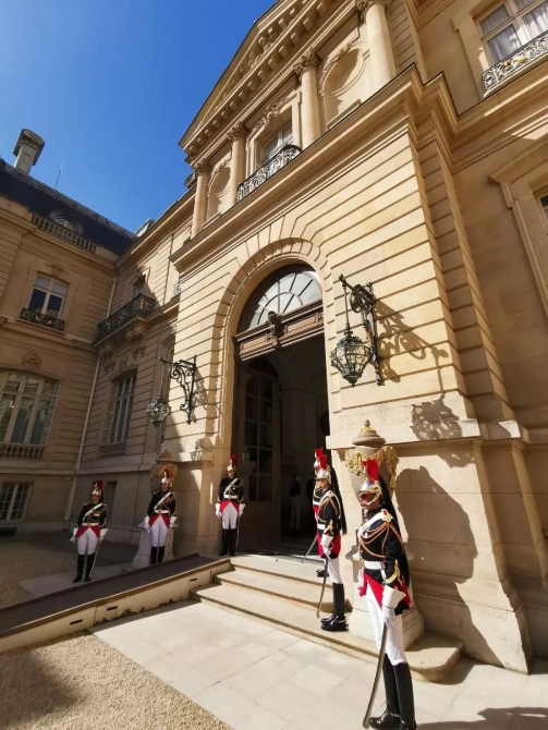 愛麗舍宮前送行的禮兵。(央視記者荊偉拍攝)