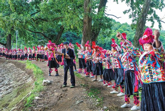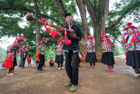省級(jí)葫蘆笙舞傳承人帶領(lǐng)村民跳彝族葫蘆笙舞