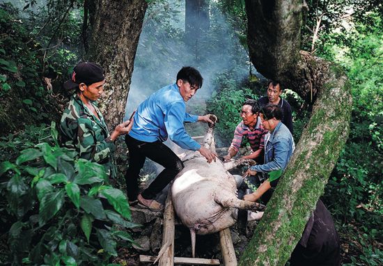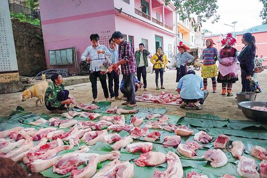 村民到大榕樹腳分發(fā)龍肉(祭祀后的豬肉叫龍肉)