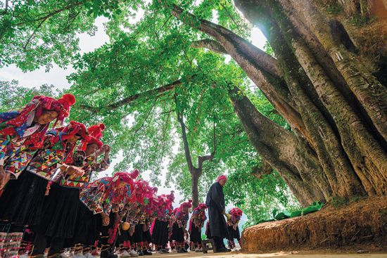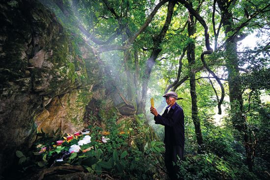 衣著盛裝的花倮婦女跟著么公進(jìn)行叩拜,感恩蕎神給花倮人予生命