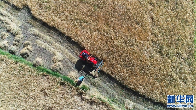 西藏定日縣農(nóng)民在收割青稞(2018年9月13日無(wú)人機(jī)拍攝)。新華社記者 普布扎西 攝