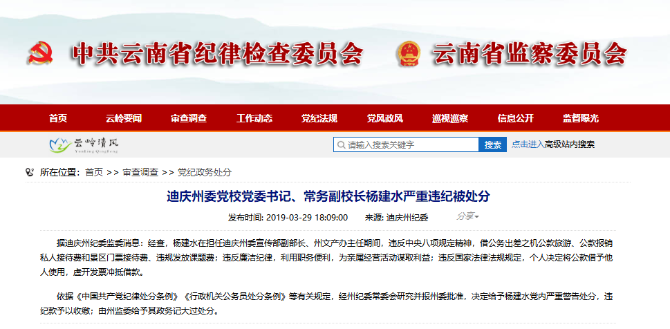 昆明信息港訊 據(jù)迪慶州紀(jì)委監(jiān)委消息:經(jīng)查,楊建水在擔(dān)任迪慶州委宣傳部副部長(zhǎng)、州文產(chǎn)辦主任期間,違反中央八項(xiàng)規(guī)定精神,借公務(wù)出差之機(jī)公款旅游、公款報(bào)銷私人接待費(fèi)和景區(qū)門票接待費(fèi)、違規(guī)發(fā)放課題費(fèi);違反廉潔紀(jì)律,利用職務(wù)便利,為親屬經(jīng)營(yíng)活動(dòng)謀取利益;違反國(guó)家法律法規(guī)規(guī)定,個(gè)人決定將公款借予他人使用,虛開發(fā)票沖抵借款。