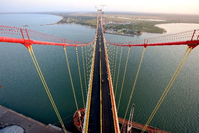 馬普托大橋及連接線項目從莫桑比克首都馬普托市向南連接南非邊境口岸以及莫旅游勝地“黃金角”,包括一座跨海灣懸索橋和數(shù)條干線公路。其中,橫跨馬普托灣的馬普托大橋全長超過3公里,主跨680米,成為非洲第一大懸索橋。該橋極大便利了馬普托灣兩岸交通,成為莫縱貫南北、連接南非的交通主干道的重要組成部分。
