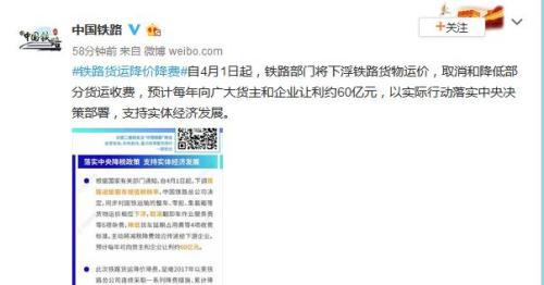 據(jù)中國鐵路總公司官方微博消息,自4月1日起,鐵路部門將下浮鐵路貨物運價,取消和降低部分貨運收費,預(yù)計每年向廣大貨主和企業(yè)讓利約60億元。