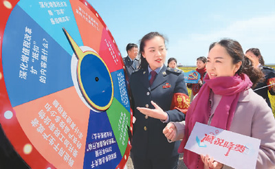 ?3月30日,江蘇省灌云縣黨員志愿者組織的“減稅降費(fèi)在行動(dòng)”微型黨課走進(jìn)潮河灣風(fēng)景區(qū),向萬(wàn)畝油菜花田里的游人傳遞減稅降費(fèi)好聲音。孫軍/攝(人民視覺(jué))