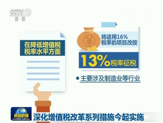 ?從今天開始,我國(guó)增值稅稅率水平將進(jìn)一步降低,將適用16%稅率的項(xiàng)目改按13%稅率征稅;將適用10%稅率的項(xiàng)目改按9%稅率征稅;保持6%一檔稅率不變。