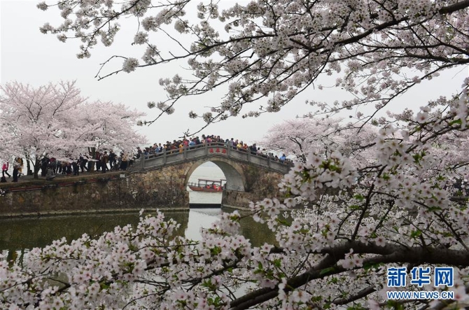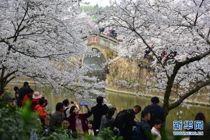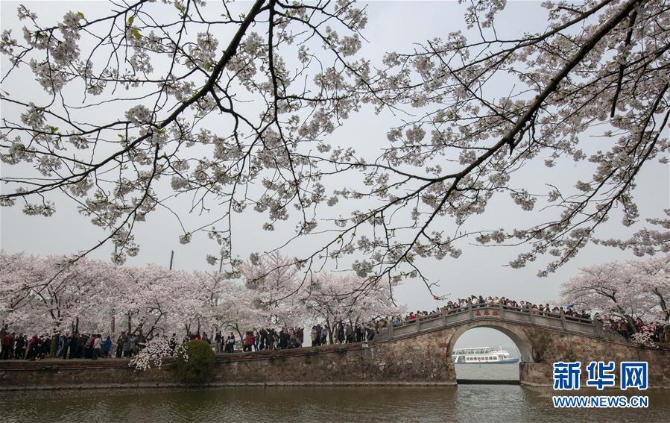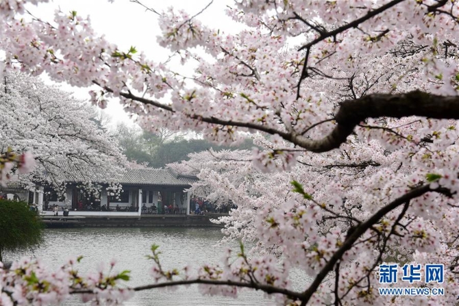 3月30日,游客在江蘇無(wú)錫太湖黿頭渚風(fēng)景區(qū)觀賞櫻花。 新華社發(fā)。還月亮/攝
