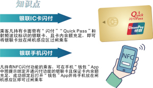 銀聯(lián)閃付包括銀聯(lián)IC卡閃付和銀聯(lián)手機(jī)閃付,銀聯(lián)IC卡閃付是指乘客凡持有卡面帶有“閃付”“Quick Pass”和射頻波紋標(biāo)識(shí)的銀聯(lián)卡且卡內(nèi)余額充足,即可將銀聯(lián)卡放在閘機(jī)感應(yīng)區(qū)過(guò)閘乘車(chē);銀聯(lián)手機(jī)閃付是指凡持有NFC閃付功能的乘客,可在手機(jī)“錢(qián)包”App中照提示綁定開(kāi)通閃付功能的銀聯(lián)卡且保證卡內(nèi)余額充足,成功綁定后打開(kāi)“錢(qián)包”App并將手機(jī)放在閘機(jī)感應(yīng)區(qū)即可過(guò)閘乘車(chē)。