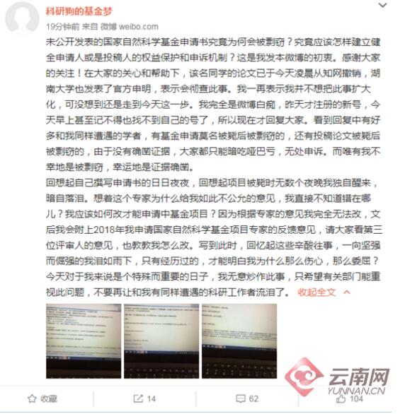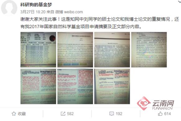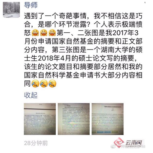 記者此前曾報(bào)道,3月27日,云南財(cái)經(jīng)大學(xué)一名副教授、研究生導(dǎo)師在微博上發(fā)帖稱,2017年3月,她以“腐敗對(duì)企業(yè)逃稅的影響效應(yīng)研究”為題,申請(qǐng)了國家自然科學(xué)基金項(xiàng)目,當(dāng)年這個(gè)項(xiàng)目沒中。這名老師表示,由于這個(gè)項(xiàng)目同時(shí)也是自己博士論文的選題,2019年3月21日,當(dāng)其完成博士論文寫作,在論文查重過程中,發(fā)現(xiàn)自己辛辛苦苦所寫的博士論文與湖南大學(xué)劉夢潔同學(xué)完成于2018年4月的碩士論文“腐敗對(duì)企業(yè)逃稅的影響研究”累計(jì)重復(fù)了15626字?!敖?jīng)過我仔細(xì)對(duì)比,劉夢潔同學(xué)的碩士論文剽竊的正是我2017年國家自然科學(xué)基金申請(qǐng)書?!?br/>