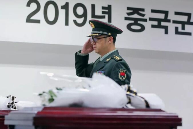 ●然后,哀樂響起,全場肅立,中國人民解放軍儀仗兵緩緩走向韓方禮兵,接回志愿軍烈士遺骸棺槨,中方代表為每具棺槨蓋上五星紅旗,并輕輕將國旗鋪好、展平,中韓雙方代表人員向烈士遺骸鞠躬致敬。