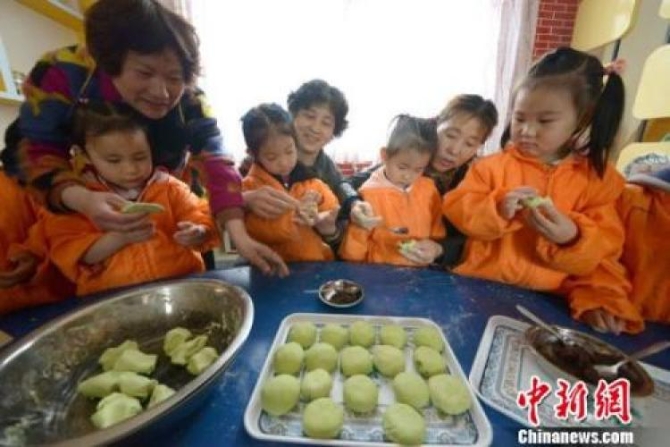 ↑資料圖:圖為小朋友在老師指導(dǎo)下包餡做青團(tuán)子。王思哲 攝