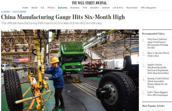 文章稱,雖然經(jīng)濟活動通常會在春節(jié)長假過后的三四月份回暖,但一些經(jīng)濟學家表示,今年3月份制造業(yè)PMI全面強勁反彈,表明政府解決融資難、減稅及其他支持經(jīng)濟發(fā)展的措施正在奏效。