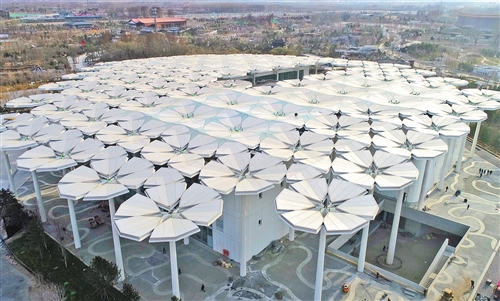 ?4月1日拍攝的北京世園會國際館外景(無人機拍攝)。經(jīng)濟日報記者 趙 晶/攝