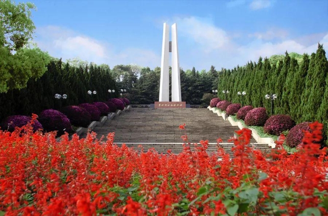 ?紀(jì)念碑,通體高27米,漢白玉飾面。仰望紀(jì)念碑,“雙桅風(fēng)帆”造型的碑身莊嚴(yán)挺拔。黑色花崗巖碑座的正面飾以棗紅色大理石、嵌金鐫刻陳云同志題寫的 “革命烈士永垂不朽”