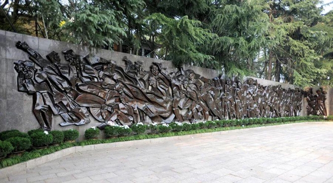?銅浮雕壁,紫銅煅軋,高4.5米、長82米,圍繞在紀(jì)念碑的背后及兩翼