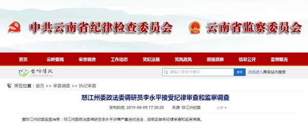 昆明信息港訊 據(jù)怒江州紀(jì)委監(jiān)委消息:怒江州委政法委調(diào)研員李永平涉嫌嚴(yán)重違紀(jì)違法,目前正接受紀(jì)律審查和監(jiān)察調(diào)查。