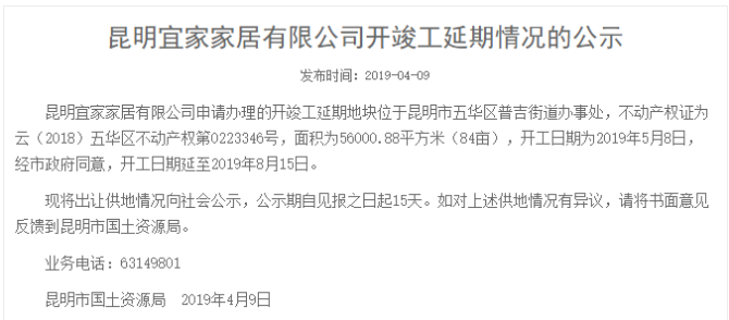 昆明信息港訊(昆明日報(bào) 記者吳勁松)4月9日,昆明市國土資源局發(fā)布《昆明宜家家居有限公司開竣工延期情況的公示》。內(nèi)容顯示,昆明宜家的開工時(shí)間將從原定的2019年5月8日,延至2019年8月15日。