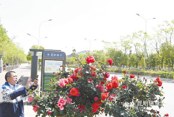 圖為彩云南路口公交車(chē)站被盛開(kāi)的月季花簇?fù)?,行人忍不住拍照定格這春天的美好。記者楊艷輝攝影報(bào)道