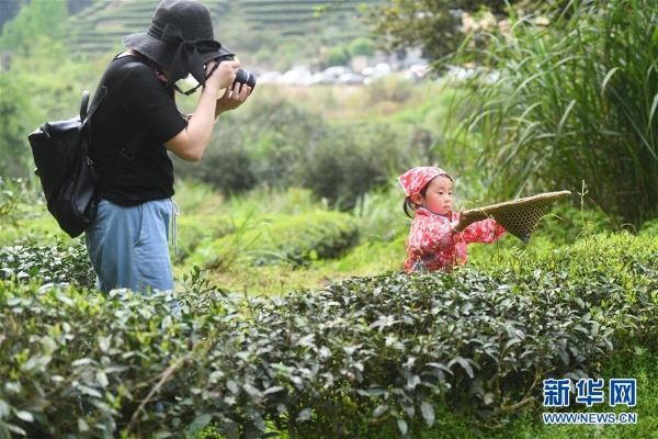 4月9日,在武夷山市天心村蓮花峰下,游客在為采茶的小朋友拍照。 當(dāng)日,福建省武夷山市舉行“喊山祭茶”活動,吸引不少游客身著傳統(tǒng)服飾前來體驗(yàn)采茶。 新華社記者 宋為偉 攝