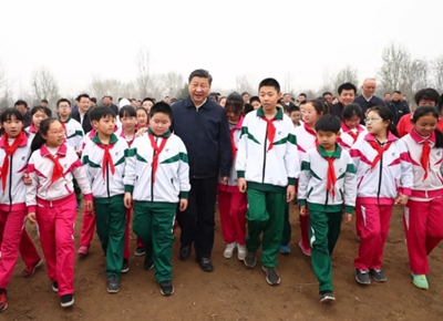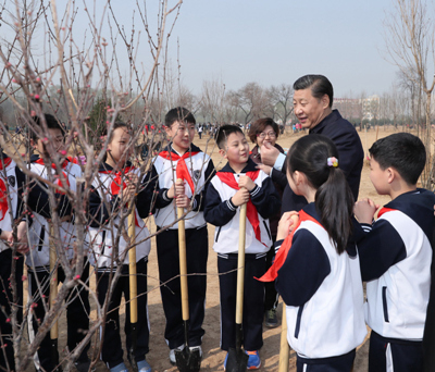 在今年的首都義務(wù)植樹(shù)活動(dòng)中,習(xí)近平一邊勞動(dòng),一邊向身邊的少先隊(duì)員詢問(wèn)學(xué)習(xí)生活和體育鍛煉情況,叮囑他們從小養(yǎng)成愛(ài)護(hù)自然、保護(hù)環(huán)境的意識(shí),用自己的雙手把祖國(guó)建設(shè)得更加美麗,祝他們像小樹(shù)苗一樣茁壯成長(zhǎng)。