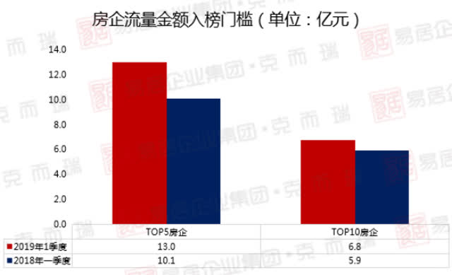 一季度企業(yè)前十銷售總金額184.0億元,其中,TOP5房企入榜門檻13.0億元,市場(chǎng)占有率為46.8%。TOP10房企入榜門檻為6.8億元,市場(chǎng)占有率為61.4%。
