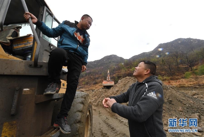 ?平山縣下槐鎮(zhèn)南文都村駐村第一書記張端樹(右)和治理河道的工人交流(4月9日攝)。 新華社記者朱旭東/攝