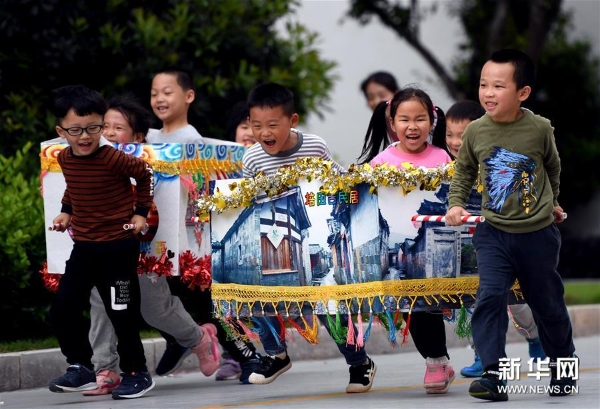 4月10日,連城縣實(shí)驗(yàn)幼兒園兒童展示“芷溪?jiǎng)澓荡薄?新華社記者 彭張青 攝