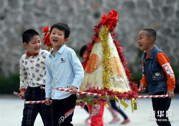 4月10日,連城縣實(shí)驗(yàn)幼兒園兒童展示“北團(tuán)游大粽”。 新華社記者 彭張青 攝