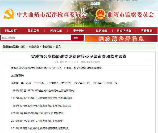 昆明信息港訊 據(jù)曲靖市紀(jì)委監(jiān)委消息:宣威市公安局原政委龍德留涉嫌嚴(yán)重違紀(jì)違法,目前正在接受紀(jì)律審查和監(jiān)察調(diào)查。