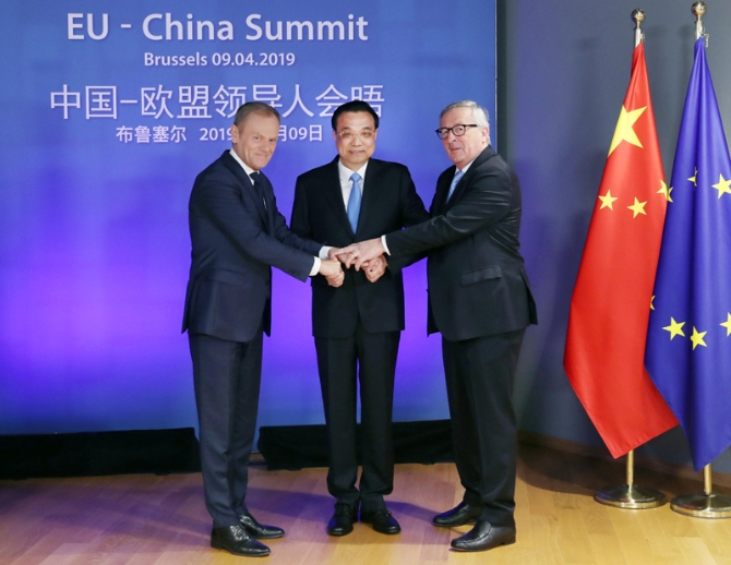 當(dāng)?shù)貢r(shí)間四月九日下午,國(guó)務(wù)院總理李克強(qiáng)在布魯塞爾歐洲理事會(huì)總部同歐洲理事會(huì)主席圖斯克、歐盟委員會(huì)主席容克共同主持第二十一次中國(guó)—?dú)W盟領(lǐng)導(dǎo)人會(huì)晤。新華社記者劉衛(wèi)兵/攝