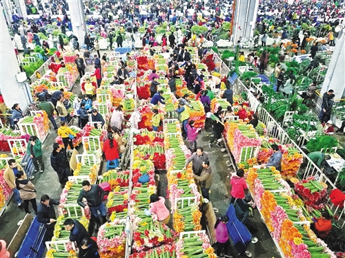 云南省昆明市斗南花卉市場(chǎng)現(xiàn)已發(fā)展成為亞洲最大的鮮切花交易市場(chǎng)。圖為斗南花卉市場(chǎng)繁忙的夜間交易景象。經(jīng)濟(jì)日?qǐng)?bào)記者黃俊毅/攝
