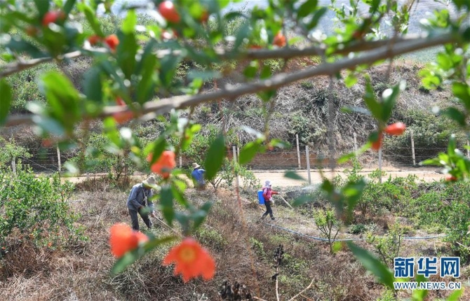 4月8日,在云南彌勒朋普鎮(zhèn)慶來村的荒山上,工人在石榴果樹林中勞作。記者楊宗友攝