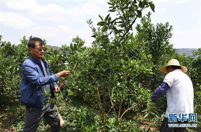 ?4月8日,在云南彌勒朋普鎮(zhèn)可樂村的荒山上,工人在修剪柑橘樹枝葉。新華社 記者楊宗友攝