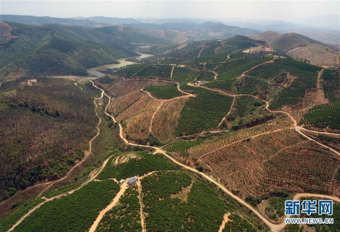 ?這是4月8日無人機(jī)拍攝的云南彌勒朋普鎮(zhèn)可樂村荒山上的果園。新華社 記者楊宗友攝