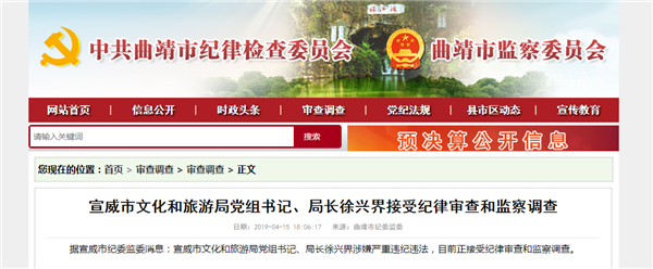 昆明信息港訊 宣威市紀(jì)委監(jiān)委4月14日發(fā)布消息:宣威市文化和旅游局黨組書記、局長徐興界涉嫌嚴(yán)重違紀(jì)違法,目前正接受紀(jì)律審查和監(jiān)察調(diào)查。