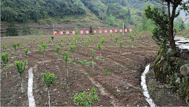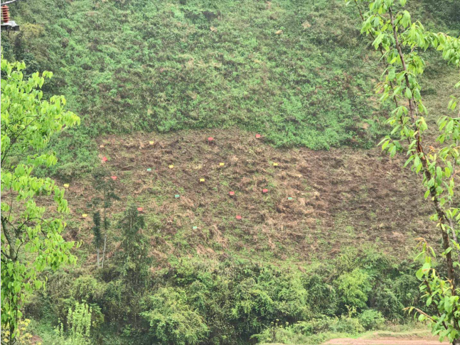 △這是2017年底種下的木瓜樹苗。預(yù)計(jì)明年秋天它們可以掛果。漫山遍野的木瓜樹在花期既美麗又是很好的蜜源,促進(jìn)當(dāng)?shù)氐纳鷳B(tài)旅游和蜂蜜產(chǎn)業(yè),可以一舉多得。(央視記者黃京輝拍攝)