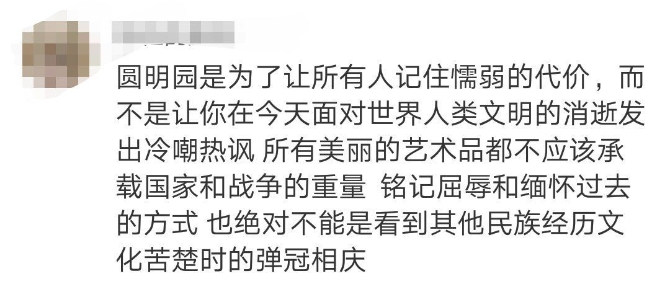 這場大火讓人不自覺想到中國文化曾經(jīng)歷的磨難,曾經(jīng)那場燒了三天三夜的大火,萬園之園留下的灰燼,是中國歷史恥辱柱上最疼的一根釘子。
