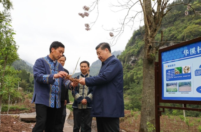 站在田間地頭,習(xí)近平拿著中藥材黃精,詳細(xì)了解該村通過種植特色經(jīng)濟(jì)作物帶動(dòng)村民脫貧的情況。