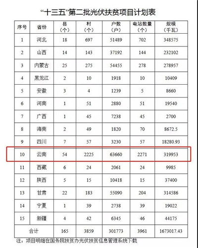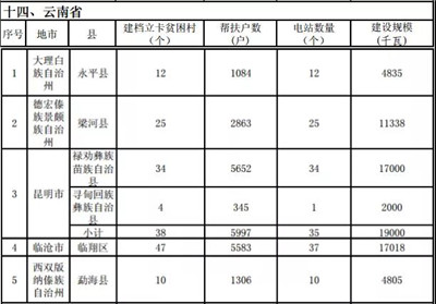 2017年12月,國家能源局與國務(wù)院扶貧辦聯(lián)合下達(dá)了“十三五”第一批光伏扶貧項(xiàng)目計劃。其中,涉及云南省6個縣,132個建檔立卡貧困村,幫扶戶數(shù)16833戶,電站數(shù)量119個建設(shè)規(guī)模56996千萬。