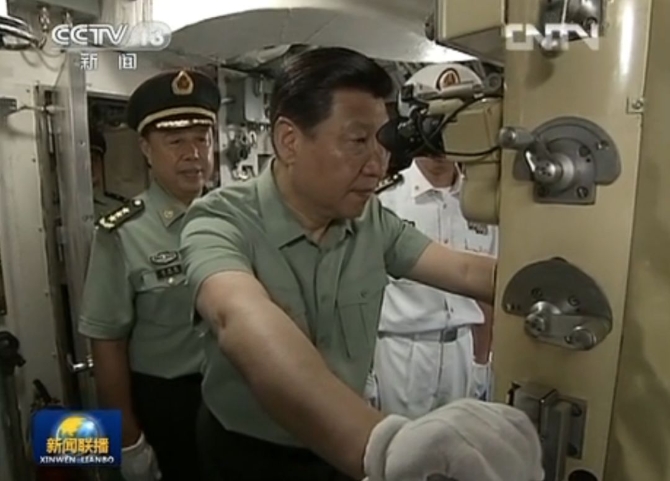 2013年4月9日,習(xí)近平主席來到海軍駐三亞部隊(duì),先后視察了我國(guó)自行設(shè)計(jì)建造的兩棲作戰(zhàn)艦艇“井岡山”艦和某新型潛艇。他下艙室、上甲板、進(jìn)入艦載直升機(jī)機(jī)艙,了解武器裝備性能,詢問官兵的訓(xùn)練生活情況,接受水兵們贈(zèng)送的艦帽、艦徽,并在航泊日志上簽名。