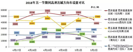 從圖中可以看出,2018年“五一”假期,出城方向的五條高速除昆曲高速車流量在假期末日(5月1日)達高峰外,其余高速車流量均在假期首日(4月29日)達到最高峰,其中,往滇西方向經(jīng)昆安高速出城車流量最多;往玉溪方向經(jīng)昆玉高速出城車流量次之;昆石、昆曲、昆武三條高速的車流量相差不大,均明顯低于昆楚、昆玉兩條高速的車流量。