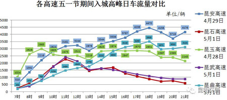 從各高速五一節(jié)期間入城高峰日車流量對比情況可以看出,昆安高速、昆曲高速車流量在高峰日18時達到最大,昆石高速和昆武高速在高峰日11時車流量達到最大,昆玉高速在高峰日9時達到最大。