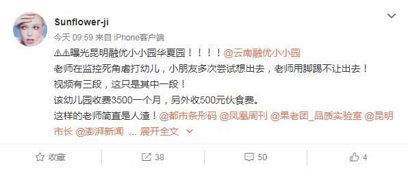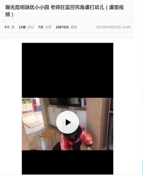 4月24日中午,網(wǎng)友“Sunflower-ji”在新浪微博發(fā)帖“曝光昆明融優(yōu)小小園華夏園”,表示該幼兒園發(fā)生老師毆打幼兒事件。隨后,有網(wǎng)友在昆明某知名論壇發(fā)帖,并附上疑似現(xiàn)場(chǎng)視頻和已經(jīng)報(bào)警等聊天記錄截圖。