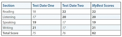 關于怎樣拼分,請看ETS官方給出的例子:(圖片一)。第1次考試閱讀、聽力、口語、作文4個單項分別是24、19、20、21,總分是84。第2次考試閱讀、聽力、口語、作文4個單項分別是23、20、20、23,總分是86。第3次考試閱讀、聽力、口語、作文4個單項分別是23、22、21、22,總分是88。