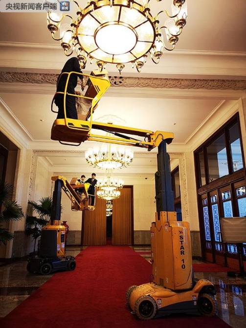 下午兩點(diǎn),人民大會(huì)堂工作人員正在檢修北大廳照明燈,確保外事活動(dòng)的順利舉行。(央視記者史偉拍攝)