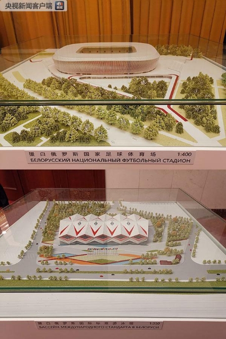 當(dāng)天,兩國(guó)元首共同為中方援白體育場(chǎng)、游泳館項(xiàng)目模型揭幕。這是兩個(gè)項(xiàng)目的模型。(央視記者楊立峰拍攝)