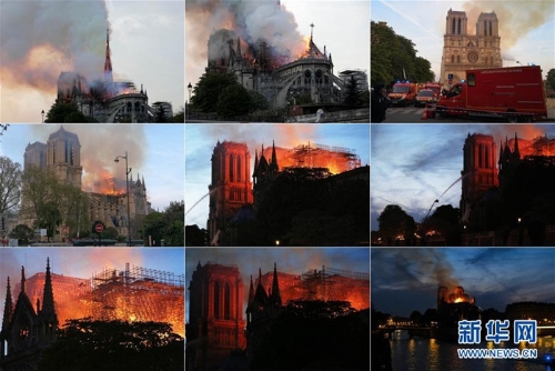 ?這張拼版照片顯示的是4月15日,在法國(guó)巴黎,巴黎圣母院燃起大火。當(dāng)?shù)貢r(shí)間15日傍晚,位于巴黎市中心、有著800多年歷史的巴黎圣母院發(fā)生大火,熊熊烈火之中,巴黎圣母院塔尖轟然倒塌,整座建筑損毀嚴(yán)重。新華社發(fā)